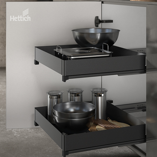 Sistema de pés niveladores, deslizadores, suportes de rodapé e outros acessórios Capacidade de carga por pé 450 kg, no máx. 1350 kg com 3 ou mais pés Fixação segura do pé nivelador no deslizador durante a instalação e deslocação do armário Grande superfície de apoio de ø 78 ou 80 mm Regulação simples da altura Gaveta de rodapé possível a partir de 150 mm de altura plástico preto