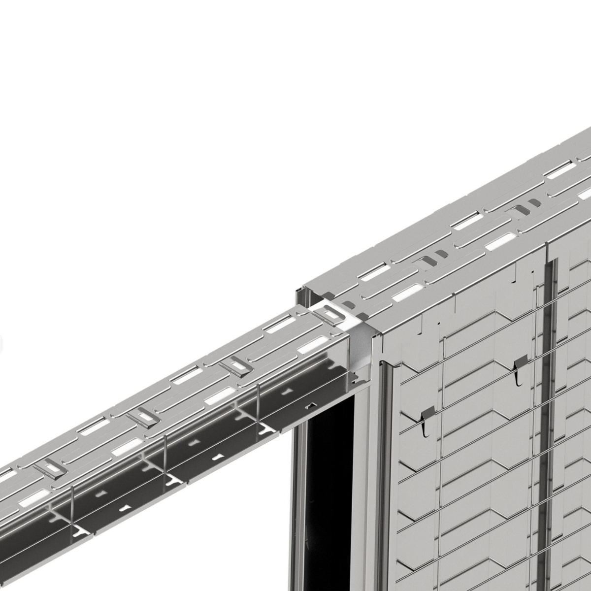 Calhas em alumínio com guia superior totalmente invisível, sem guias inferiores, e com carrinho com rolamentos de esferas.