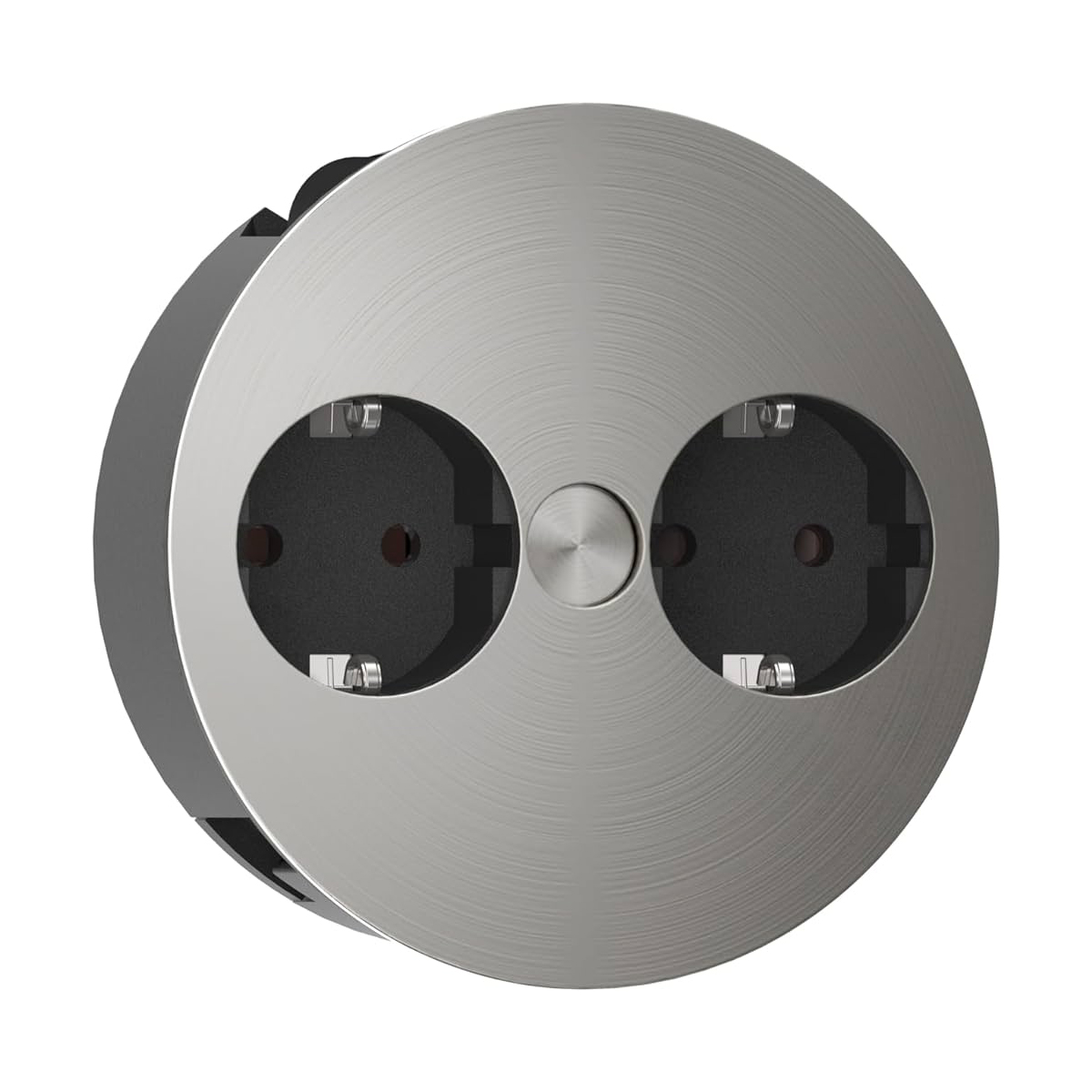 Tomada de embutir com 2 entradas Schuko e acabamento em aço inox. Cabo com 2 metros.